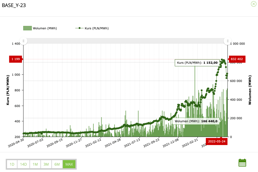 Giełdowe ceny energii rosną już od dłuższego czasu. Jednakże największe wzrosty obserwujemy od kwietnia 2022 roku. Od tego czasu ceny energii na giełdzie wzrosły z poziomu około 800 zł/MWh do prawie 1000 zł/MWh. W ciągu pół roku kontrakt na dostawę energii na 2023 rok wzrósł z około 550 zł/MWh do 1000 zł/MWh a chwilami zbliżał się nawet do 1200 zł/MWh. Na wykresie poniżej widać cenę energii, którą można zakontraktować na 2023r na Towarowej Giełdzie Energii – Jest to wykres zmian dla kontraktu terminowego na energię elektryczną na rok 2023, tzw. base Y-23.